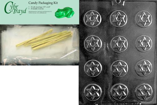 Cybrtrayd Star of David Mints Chocolate Candy Mold with Chocolate Packaging Bundle, Includes 25 Cello Bags, 25 Gold Twist Ties and Exclusive Cybrtrayd Copyrighted Chocolate Molding Instructions