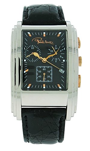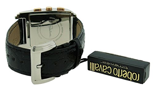 Features; Rectangular textured outer rim black analog face. White and rose gold tone indices. Chronograph dials at the 3, 6, and 9 o'clock positions. Date window at the 4 o'clock position. Snake form rose gold tone hour and minute hands. Stainless steel beveled fixed bezel. Stainless steel case and case back. Glossy black padded crocodile watch band. Stainless steel buckle.Feature