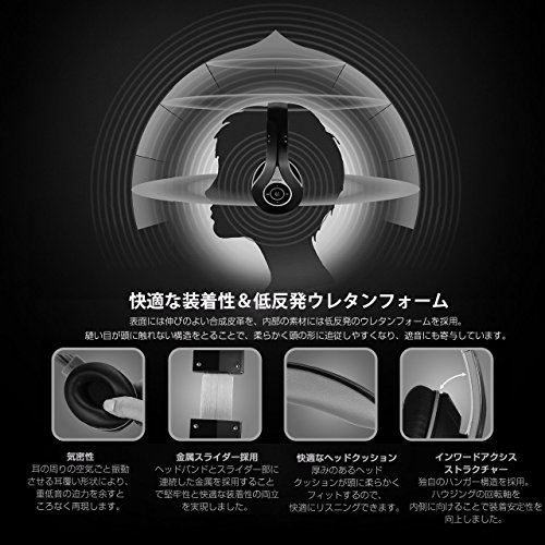 【快適な装着性】:表面には伸びのよい合成皮革を、内部の素材には低反発のウレタンフォームを採用。縫い目が頭に触れない構造をとることで、柔らかく頭の形に追従しやすくなり、遮音にも寄与しています。イヤーパッドが内側に倒れ込む構造を採用し、耳を包みこむような快適な装着性と高い気密性を実現。音漏れを低減し、重低音域の迫力をあますところなく再現します。