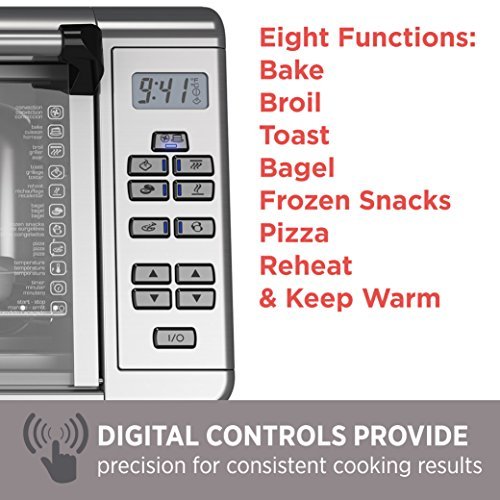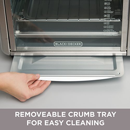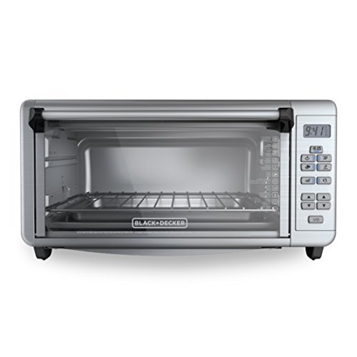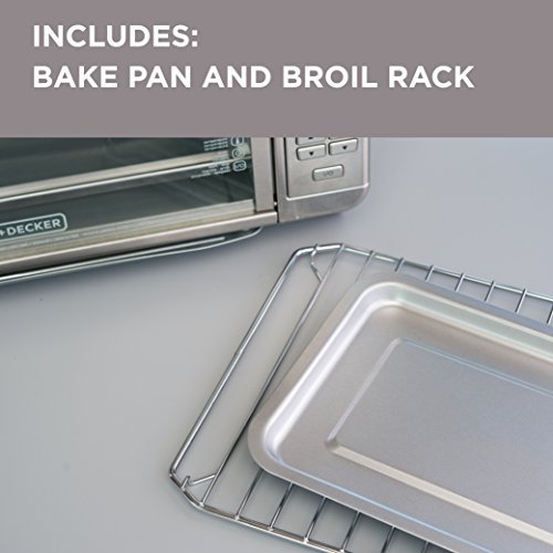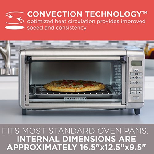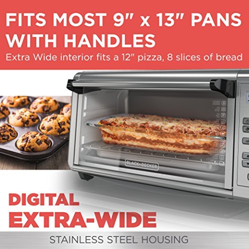 Wait! Don’t preheat the big oven! The BLACK+DECKER Extra-Wide 8-Slice Stainless Steel Digital Convection Countertop Toaster Oven with Broiler Pan has room for a 9”x13” pan with handles, so you can make a proper meal for the whole family right on your countertop! The convection fan ensures fast and even heating for all your baking tasks, and seven separate cooking functions provide ideal heat for broiling, toasting, and more! The toaster oven includes a broiler pan and three rack positions so you can cook a wide range of meal sizes. Plus, digital controls make it easy to select time, temperature, and cooking function, with a toast shade timer and a 120-minute precision timer with auto shutoff. When it’s time to eat, trust the #1 brand in toaster ovens**?BLACK+DECKER. *Compared to BLACK + DECKER TO1660B. Seven functions dedicated cooking functions include: convection bake, broil, toast, bagel, reheat, pizza, and frozen snacks. 12” Pizza, 8 Slices of bread the expanded toaster oven fits nicely on the countertop, while the interior makes room for 12” pizzas and 8 slices of bread.