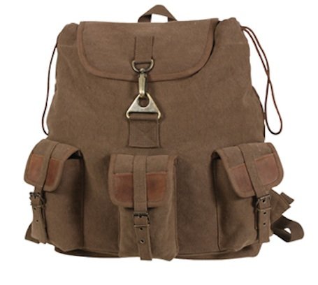 -. Brand : Rothco -. Department : mens -. Feature : Backpack, Heavyweight cotton canvas, 16.5" x 13" x 6" / Large main compartment with top flap / Drawstring top / 3 front pockets with leather flap and antique brass closure / Leather bottom -. ProductGroup : Apparel -. ProductTypeName : APPAREL -. SKU : 9693 -. Title : Rothco Vintage Wayfarer Backpack With Leather Accents
