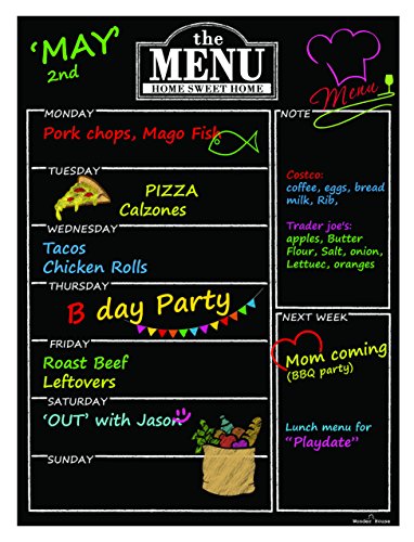 Magnetic Refrigerator Chalkboard Dry Erase Weekly Menu Meal Planner Organizer Note Area for Shopping List Fitness Diabetic Meal Prep Planning One Calendar Week 12" X 16" Fridge Black Fluorescent Board