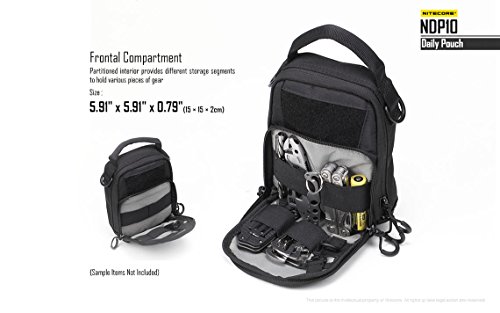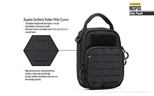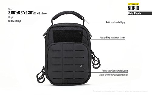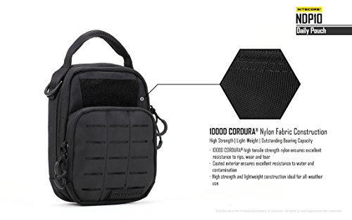 -. Feature : DESIGNED FOR DAILY USE - The Nitecore NDP10 is designed to meet all of your EDC needs with solid construction, tons of storage, and multiple ways to carry / INCREDIBLY DURABLE - Made with Military-Spec 1000D CORDURA® light-weight nylon, coated for added water resistance and fully padded walls to protect items such as phones, tablets, and other devices / TONS OF STORAGE - Features two storage compartments with elastic straps to hold gear in place and fully-unzippable pockets so your gear stays organized and you're never digging around for something in the bottom of a bag / ADJUSTABLE CARRY - Attached your pouch to a belt, carry with the included shoulder strap or use the reinforced handheld grip, this bag adapts to your needs. / Comes with an included shoulder strap as well as a LumenTac battery organizer capable of holding 2x 18650 or 4x CR123A batteries so your batteries stay as organized as the rest of your gear