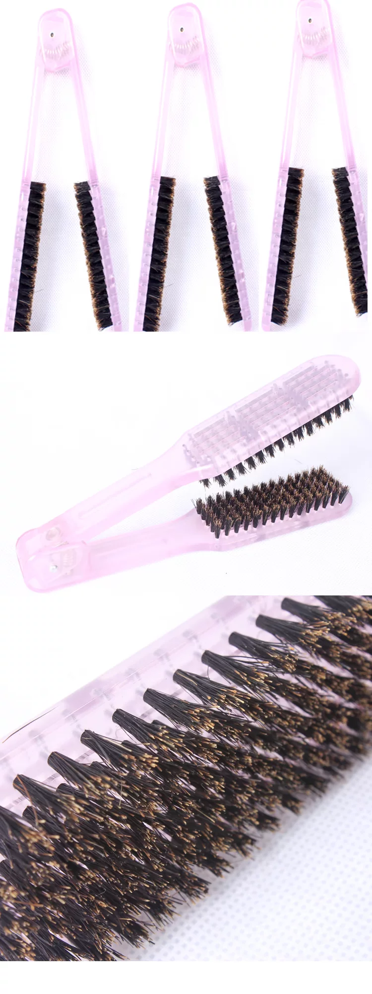 注意:每批货手柄的木质颜色会与图片有少许差异,以实物为准.梳齿材质:防静电及耐高温材料+猪鬃毛.<非纯猪鬃毛.因为纯猪鬃毛会变型.且不耐高温> 规 格:215*40*10mm(10mm为柄厚度),毛长13mm;独特的V型设计可以轻轻松松的把头发拉直,特别适合洗发后使用,效果显著。 注意:如果想做到离子烫的直发效果,还是不要这款梳子了,它只能做到自然拉直的效果哦,去除静电,鬃毛养发是它的原理,购买之前请摆正心态-.-~~做了直发后保养相当不错的. 天然鬃毛加防静电耐高温材料精心制作的发梳,在吹头发的时候不会因为高温而有任何变化,不伤发质!可以闭合洗发后或干燥时发丝张开的毛鳞片,消除毛燥!并可以减低梳齿与头发之间的摩擦力,防止产生静电!还可以减少梳发时给发质带来的压力,呵护发干及头皮!与此同时,这类发梳,有助于将头皮上的皮脂带到发身,而这些皮脂就是头发最佳的天然护发素,让头发呈现自然的光泽。 使用说明:此款毛梳不能直接接触染发剂,需用中性洗涤剂清洁。 洗发后的发丝毛鳞片呈张开状,是造成头发缺水及毛燥的元凶。将头发吹至或者自然晾至七八成干时,使用这款猪鬃毛夹梳来梳头,可以闭合毛鳞片。同时拉直头发的效果也非常显著。梳完后,头发就会变得很直很亮且不会毛毛的,离子烫的人也不需要经常去做拉直,最重要的是它不会像做离子烫那样既生硬又伤发质。 【使用心得】店主属于干性天生带点卷的发质,平时洗发后头发都会特别干特别毛。现在每次洗发后都使用这款猪鬃夹梳,头发看起来闪闪亮亮的,还省下了一大笔做离子烫的费用。这也是我最爱的一款梳子了。所以我也特别希望能把这个宝贝推荐给大家,相信大家也会喜欢! 名称:直发梳 功能:梳直,头发 材料:实木+猪棕毛 颜色:木色手柄+黑色毛 尺寸:21.5CM 包装:透明 产地:广州