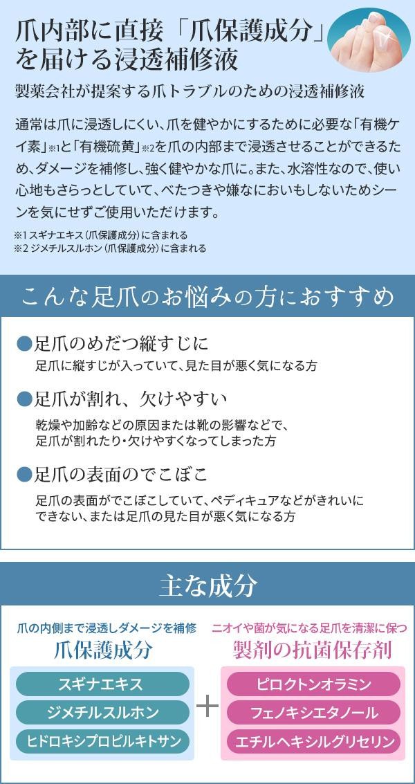 足爪の根元から表面に薄く塗るだけで地爪のケアができる足爪用の化粧料です。 |
