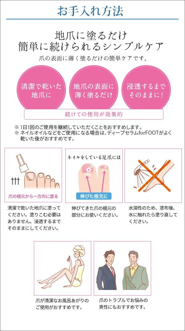 | お風呂上りにさっと塗るだけで、傷んだ足爪のダメージを補修。 |