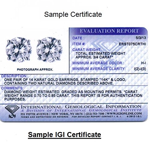 -. Feature : IGI Certified Diamonds / 3/4ct total weight. Color I-J ( Minimum). Clarity I1-I2 ( Minimum) / 14K white gold with screw-backs / IGI box included