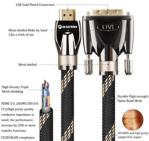 99.996% and high purity oxygen-free copper,Gold-plated contacts provide full conductivity without ghosting and data loss. Supports hot plugging of DVI display devices,high quality PVC, Nylon Mesh outer layer and shielding, purity of the digital signal and longer service life.