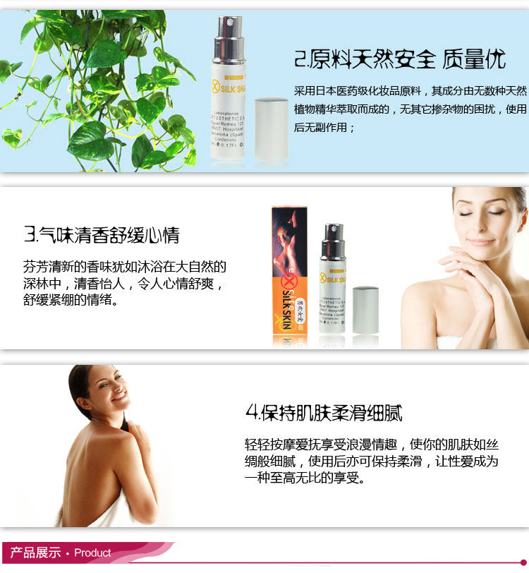 <用法与用量>行房事前15-30分钟使用,使用前要摇一摇,喷出并涂抹外阴唇和阴蒂,可紧缩阴部使血管扩张,使用后会有舒适及兴奋的感觉,按摩直到完全吸收。效果可以维持十分钟至半个小时,针对女性性冷淡及性感觉传递延迟之辅助圣品,并能达到性高潮