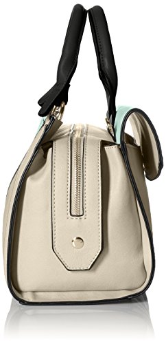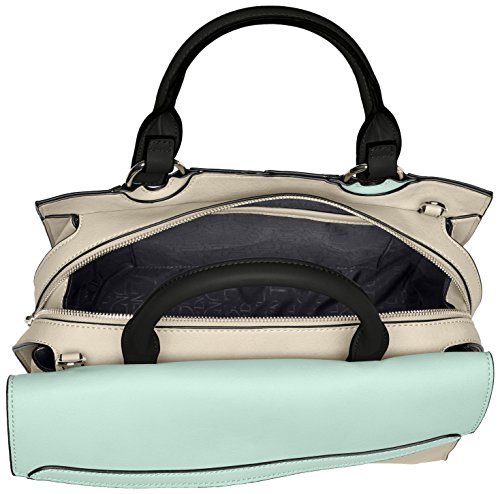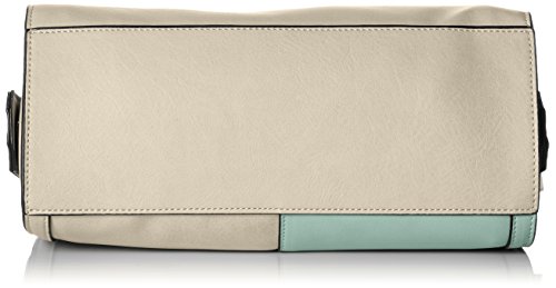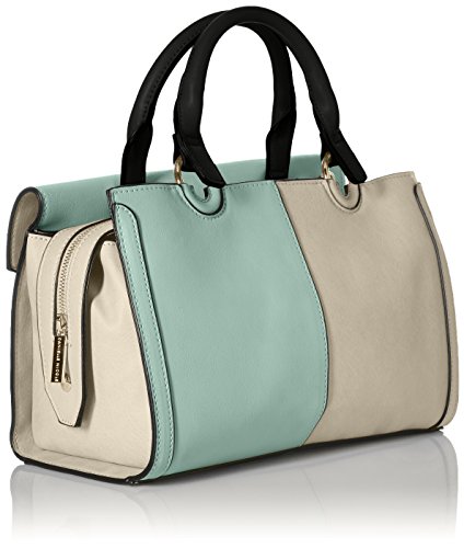 Mod-inspired satchel features an elongated silhouette with color block styling and a removable shoulder strap.