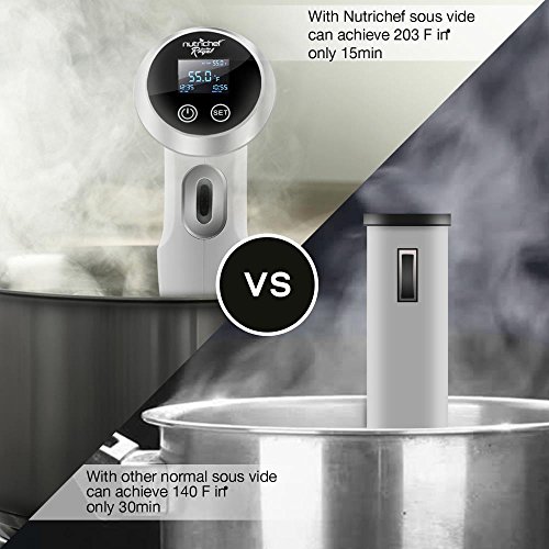 - FASTER COOKING TIME: An average sousvide immersion circulator can achieve 140F in only 30 minutes. In half the time the sous vide 120V cooker achieves 203F in only 15 mins.