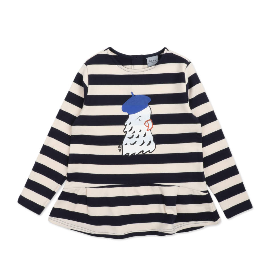 넓은 스트라이프 간격으로 스마트하고 헬시한 느낌을 줍니다. 밑단이 살짝 플레어 지는 스타일로 발랄함을 더 해주는 티셔츠로 스키니 팬츠또는 레깅스 아이템과 잘 어울리는 아이템 입니다.