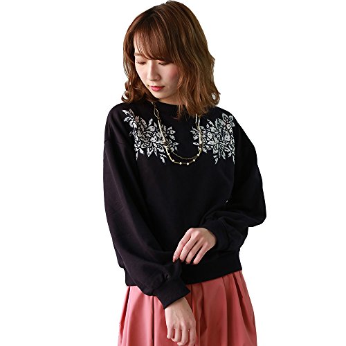 -. Feature : レトロなドット柄シフォンを使用したフラワー刺繍が目を引くプルオーバー。 / 柔らかな着心地の裏毛スウェット素材。 / 【素材】本体・リブ部分: ポリエステル66% 綿34% 別布部分: ポリエステル100% ししゅう部分: ポリエステル100%