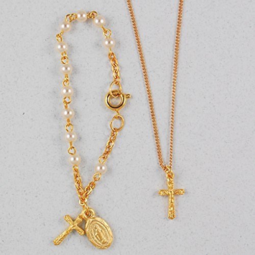 -. Title : Gold Plated Faux Pearl Infant Baby Bracelet & Crucifix Pendant Set, Boxed Childrens Girls