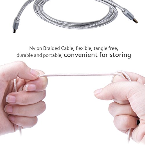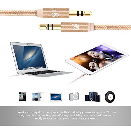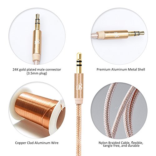 -. Feature : Premium Aluminum Metal Shell,Copper clad Aluminum Wire / Best Sound Quality Built with the same grade materials as premium headphone brands 24k gold-plated contacts ensure the cleanes sound experience possilbe / Nylon Braided Cable, flexible, tangle free,durable and protable, convenient for storing / Works with any devices equipped with standard 3.5mm audio jack or AUX-in Port,great for connecting your iPhone,iPod, MP3 or other smart phones directly to your car stereo or home theater system.