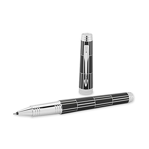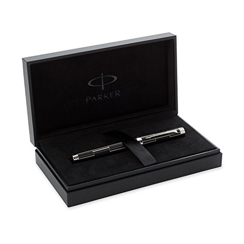 -. Feature : Finished with a black rubber effect lacquer combined with laser engraving and Palladium color / Palladium finish on trims for a trendy rendering / Solid gold nib (rhodium finish) for the ultimate experience in writing comfort and high precision lines / Manually assembled to ensure flawless quality / Ready for gifting in a premium Parker Gift Box