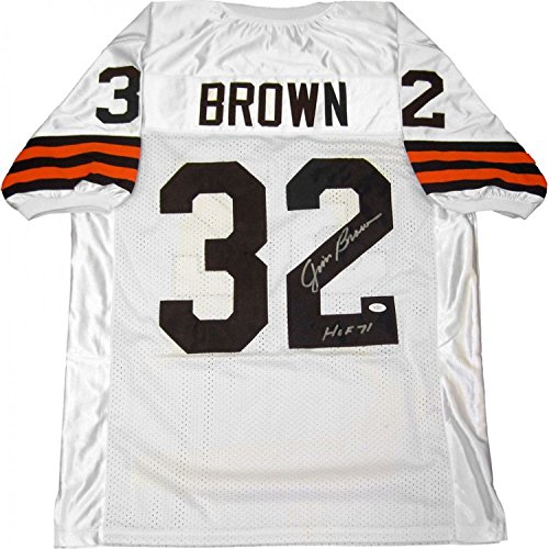 [Product Information]- This is a Jim Brown HOF 71 Autographed / Signed Cleveland Browns White Jersey signed in black sharpie and comes with a certificate of authenticity from James Spence Authentication. (JSA)