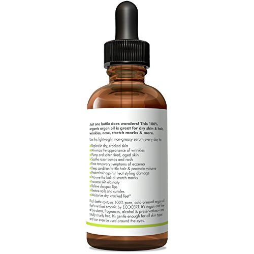 -. Feature : Just 1 Ingredient: Contains ONLY pure, cold-pressed argan oil derived straight from nature! No artificial added fragrances or preservatives. Its fresh, nutty smell is proof of its purity. / Rejuvenates Dry, Cracked Skin: Infuses skin with rich, natural, anti aging emollients including vitamins A & E. Also helps tone and improve elasticity while minimizing the look of wrinkles. / Calms Inflammation: Soothes temporarily inflamed or itchy skin related to eczema, rash, razor bumps & burn. Diminishes redness & helps improve appearance of acne & stretch marks. / Deeply Conditions Hair: Helps tame frizz, flyaways & split ends while nourishing hair and scalp. Protects against heat damage from curlers, dryers & flat irons while improving body & shine. / Organic, Made in the USA: The logos prove it! Our argan oil product is certified by both the USDA and ECOCERT. Sustainably produced and fair trade. Cruelty free and vegan, with absolutely no GMOs or pesticides.