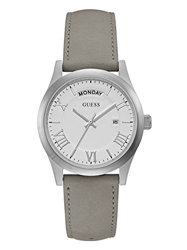 A soft, grey leather strap delivers a trend-right finish to this multifunction timepiece, designed with a silver-tone case and white dial. Includes day and date functions.Feature