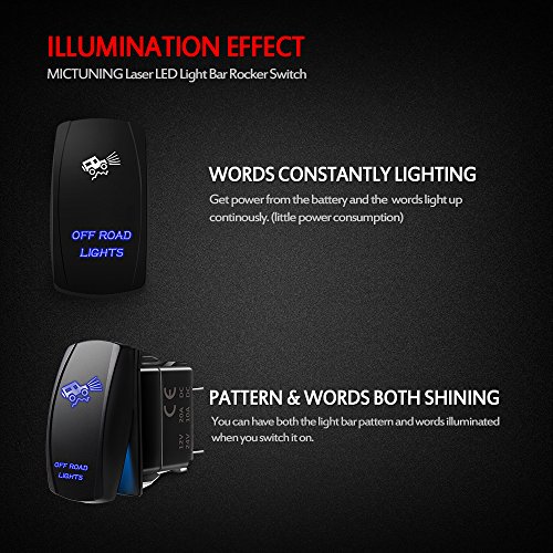 MICTUNING 5 Pin on-off Rocker Switch is SPST designed(Single pole single throw) switch, it come along with a set of jumper wires, simple to install, can easily turn on/off the lights