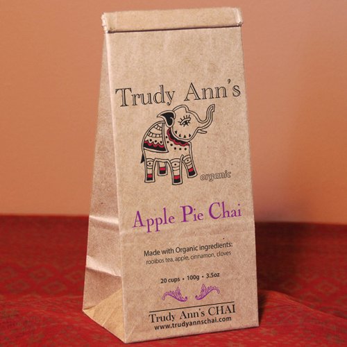 -. Binding : Misc. -. Brand : Trudy Anns Chai -. Feature : Fresh dried organic apples from Cawston, British Columbia in Canada make this a yummy, fruity tea / This tea is made from organic red rooibos, which comes from the western province of South Africa, and certified organic ingredients / All the spices are ground fresh and blended into the tea by hand / Described by customers as / Add it to desserts if you like -. Label : Trudy Ann's Chai -. Manufacturer : Trudy Ann's Chai -. PackageQuantity : 1 -. ProductGroup : Grocery -. ProductTypeName : GROCERY -. Publisher : Trudy Ann's Chai -. Studio : Trudy Ann's Chai -. Title : Apple Pie Chai - All Organic Ingredients (3.5 ounce)