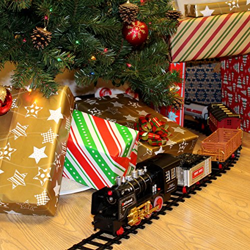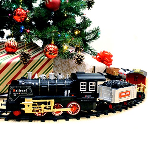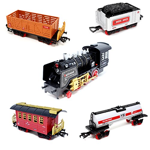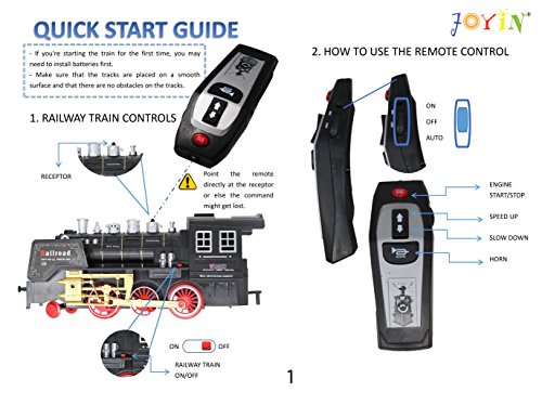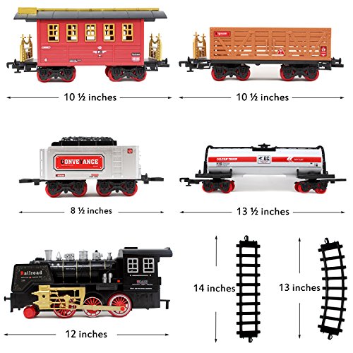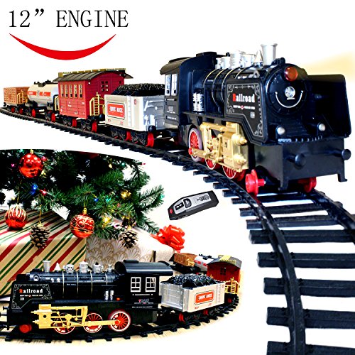 Jumbo Joyin Classic Remote-Control Christmas Electric Train Set (As Seen on TV) includes a 12-inch-Long Locomotive Engine, a 13 ½-inch-Long Oilcan Train, an 8 ½-inch-Long Conveyance, a 10 ½-inch-Long Passenger Car, a 10 ½ -inch-Long Cargo Car, a Remote Control and 16 Snap-Together Tracks. Instruction Included.