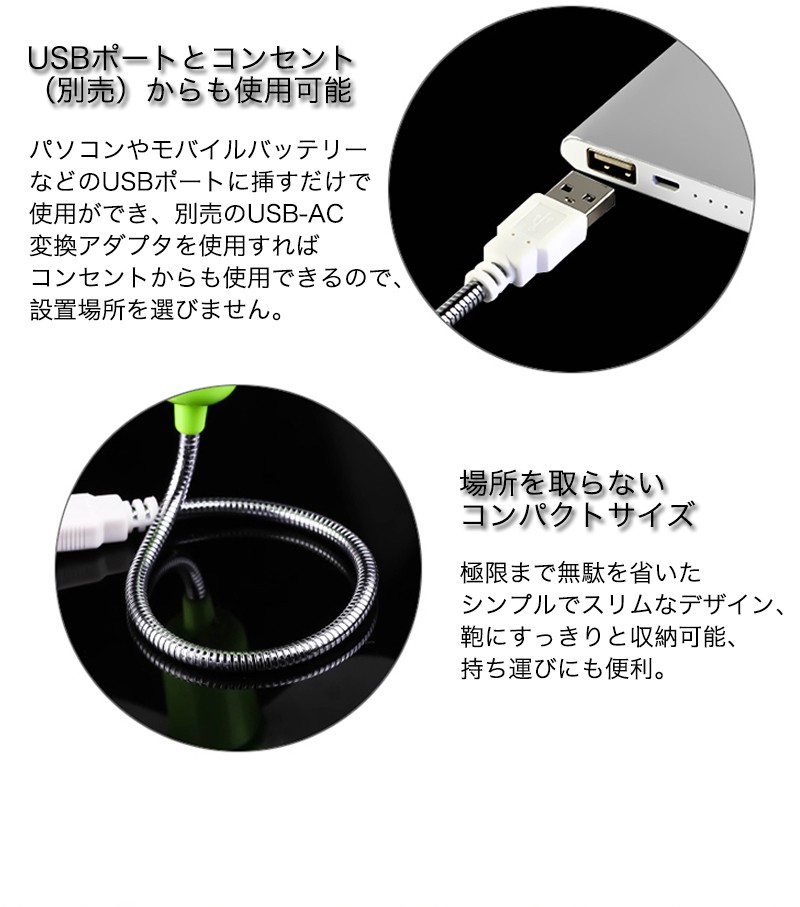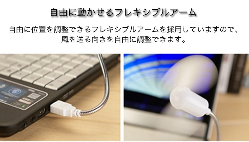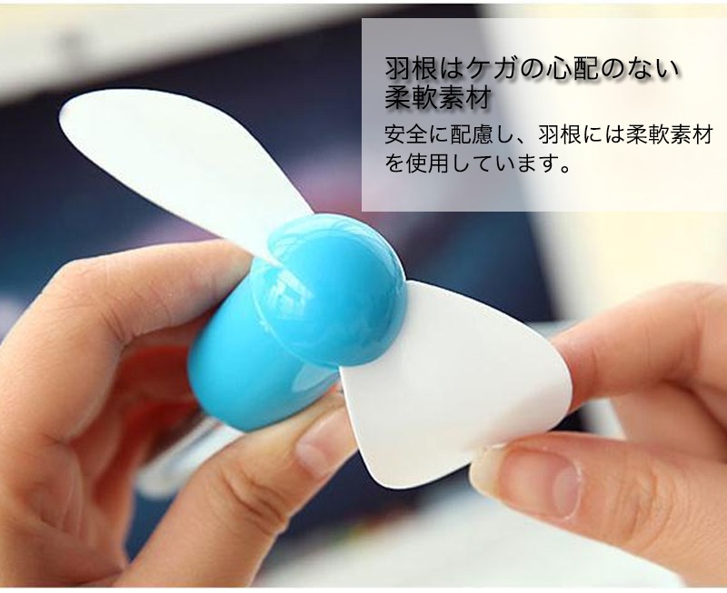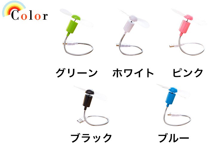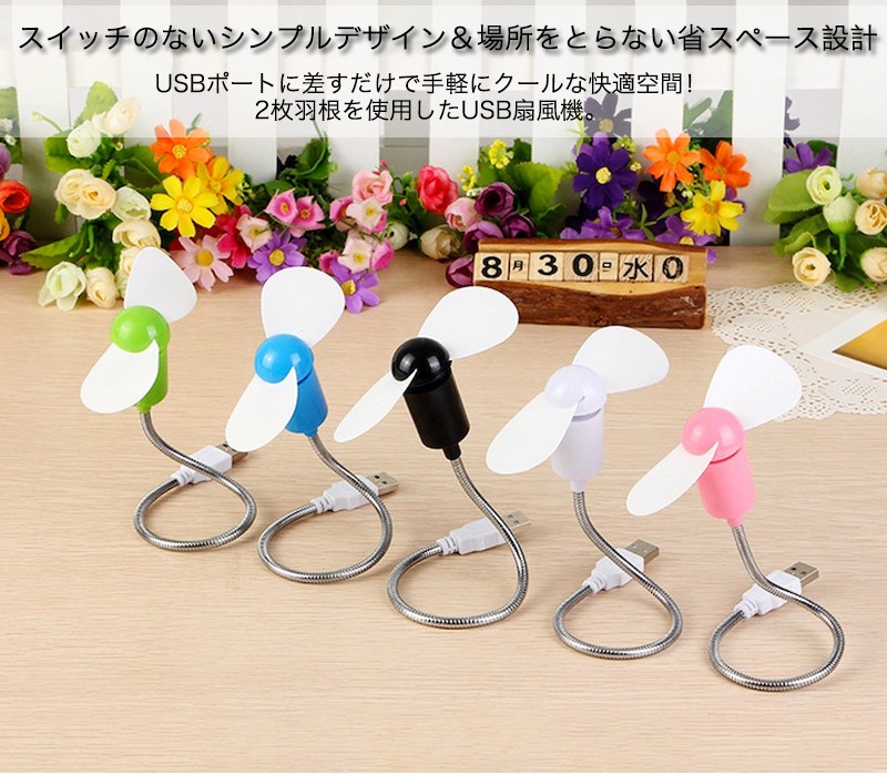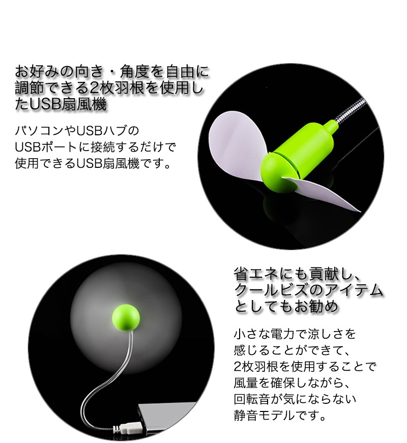 ★「カラー」ブラック(黒)、ホワイト(白)、ブルー(青)、グリーン(緑)、ピンク★「商品特徴」USBポートに差すだけで手軽にクールな快適空間!2枚羽根を使用したUSB扇風機。パソコンやUSBハブのUSBポートに接続するだけで使用できるUSB扇風機です。小さな電力で涼しさを感じることができて、2枚羽根を使用することで風量を確保しながら、回転音が気にならない静音モデルです。パソコンやモバイルバッテリーなどのUSBポートに挿すだけで使用ができ、別売のUSB-AC変換アダプタを使用すればコンセントからも使用できるので、設置場所を選びません。安全に配慮し、羽根には柔軟素材を使用しています。自由に位置を調整できるフレキシブルアームを採用していますので、風を送る向きを自由に調整できます。★「キーワード」USB扇風機 風が強い 新構造 騒音低い タッチセンサー搭載 2段階の風量 快適 便利