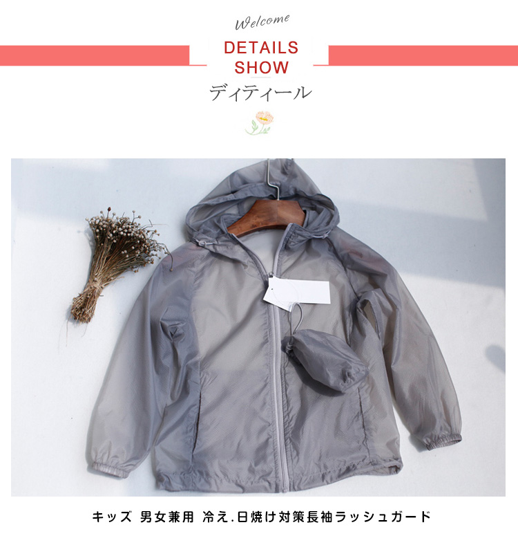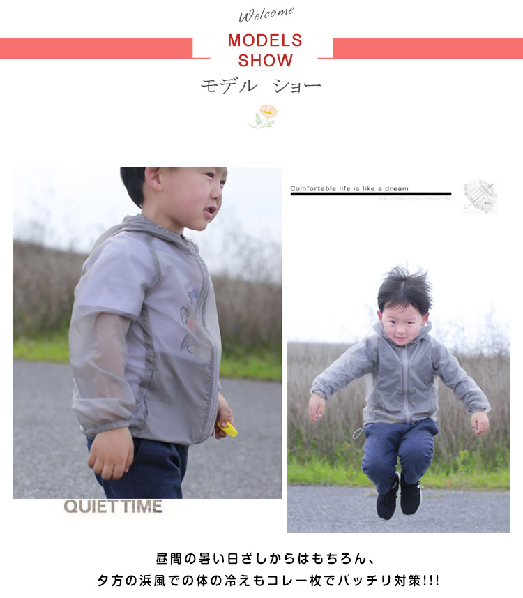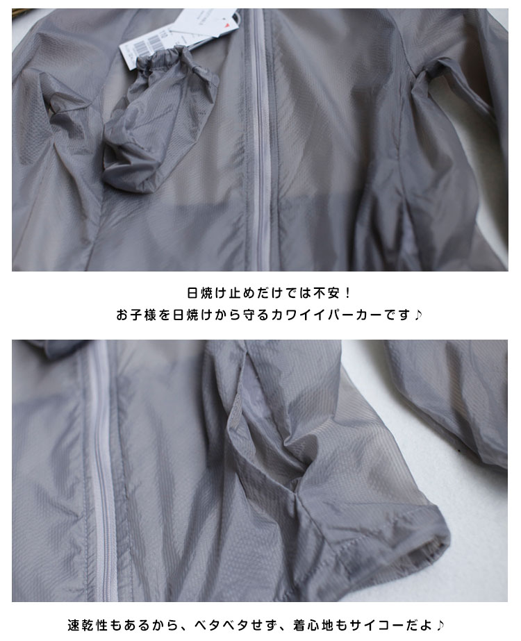 | フード付きだから使い勝手抜群! 昼間の暑い日ざしからはもちろん、夕方の浜風での体の冷えもコレ一枚でバッチリ対策!!! 暑いからなかなか上を着てくれない…そんな悩みもこれで解決!さらっと快適な着心地です☆ | |