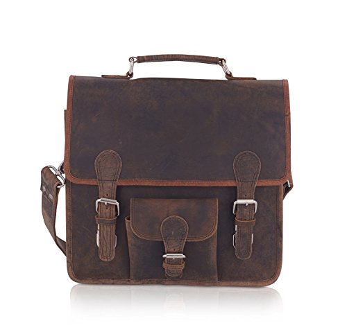 -. Feature : Handcrafted bag made from genuine high quality buffalo leather / Size: 13" (L) x 10" (H) x 4" (W) Distressed Hunter Messenger Bag / Perfect for daily use / storing I pad's , mobiles and other accessories, easy access through secure locks underneath the buckles. Removable shoulder strap so the bag can be used as a briefcase / Can be used as Leather messenger bag , I pad bag , leather satchel , leather cross body bag , leather laptop bag , leather briefcase , leather office bag / One main compartment , Two zipper pockets and inside sections to carry cellphone , cards/ pens etc. Designed by Komal Chaudhari