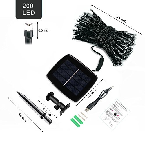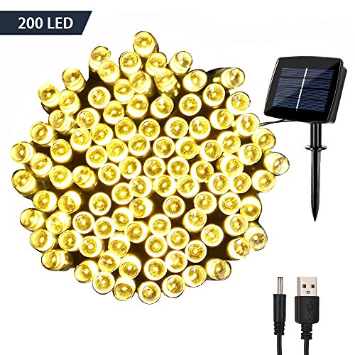 Solar Fairy String Lights Outdoor Waterproof, WOOHAHA 72ft 200LED Updated Version 6hrs Timer Function with USB Cable Solar Powered Starry String Lights for Christmas Patio Garden Party(warmwhite)