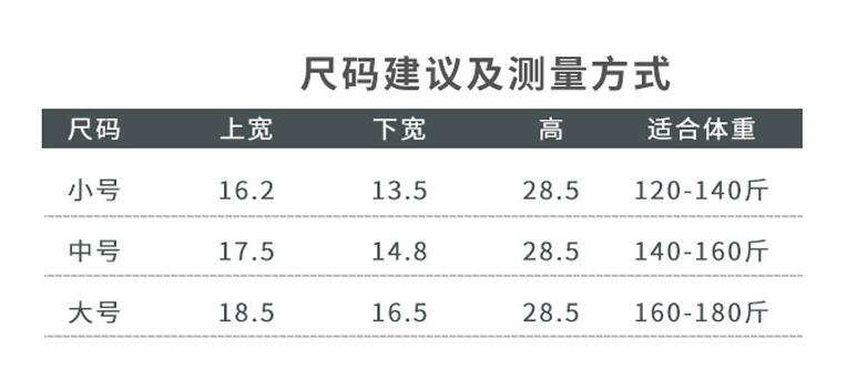 Specifications: Small width 16.2 under the width of 13.5 high 28.5cm, medium width 17.5 under the width of 14.8 high 28.5cm, large width 18.5 wide 16.5 high 28.5cm, small suitable for 120-140 pounds medium 140-160 Kg large 160-180 pounds, more flexible