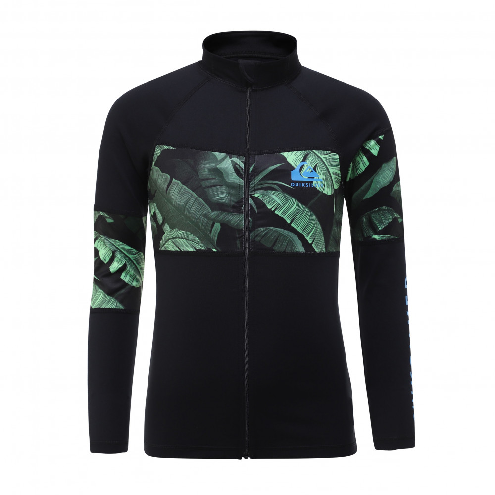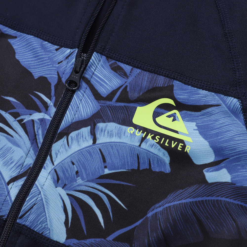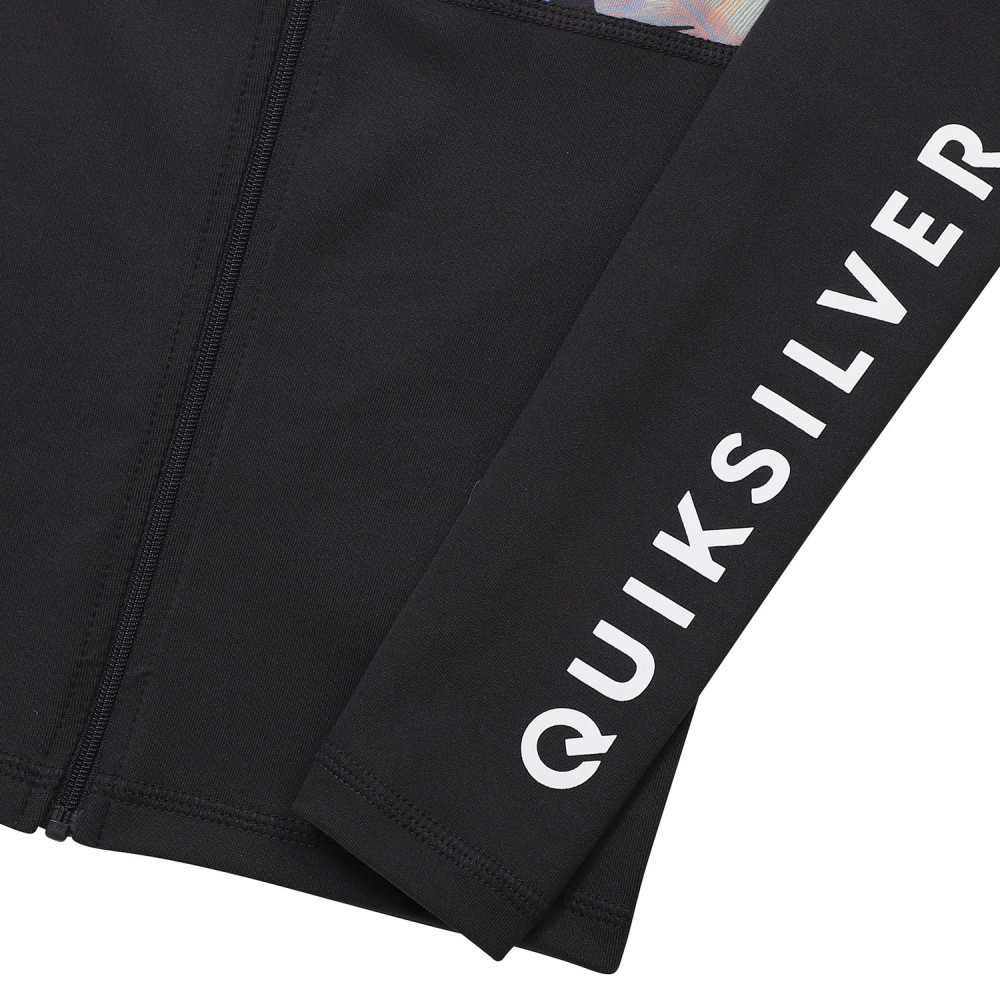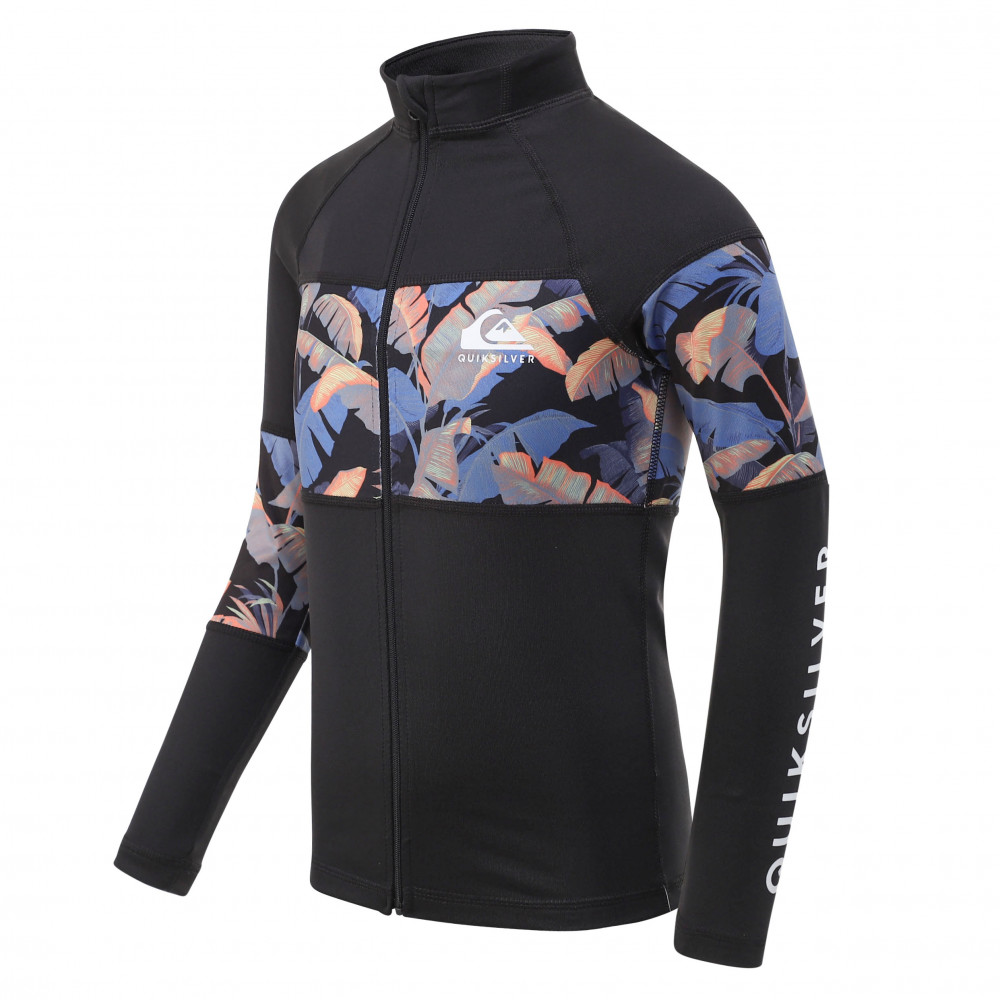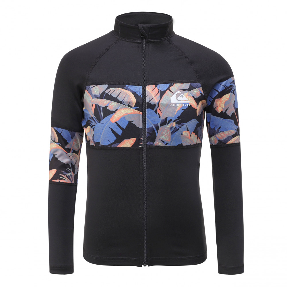자외선 차단 지수 UPF 50+의 긴 소매 집업 래쉬가드. 몸통 전체를 가로지르는 화려한 패턴의 패널이 돋보인며,편안하게 입고 벗을수 있는 상품입니다.