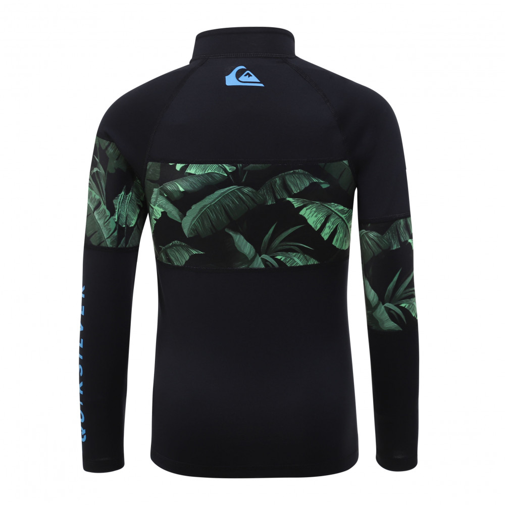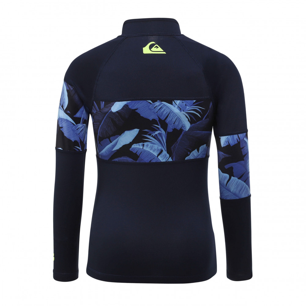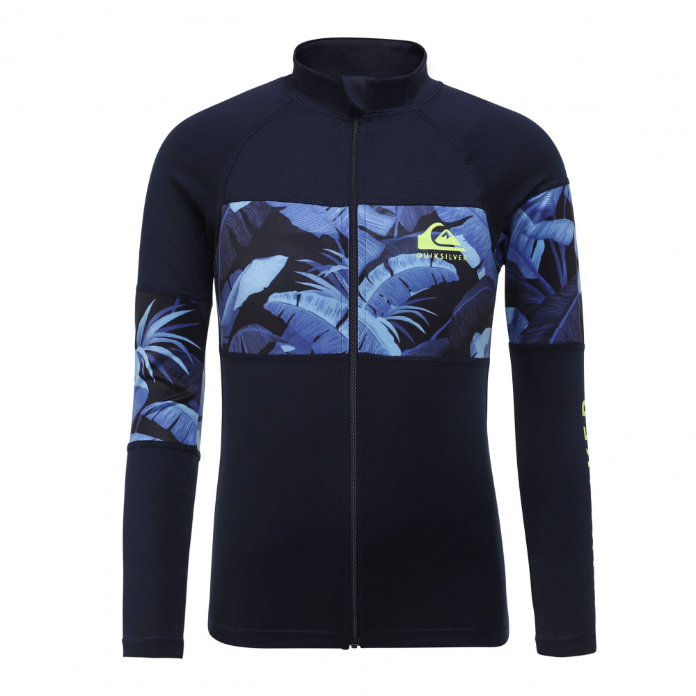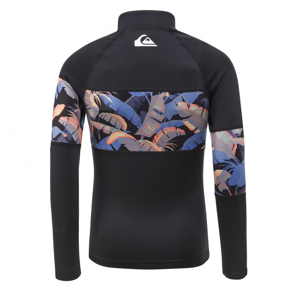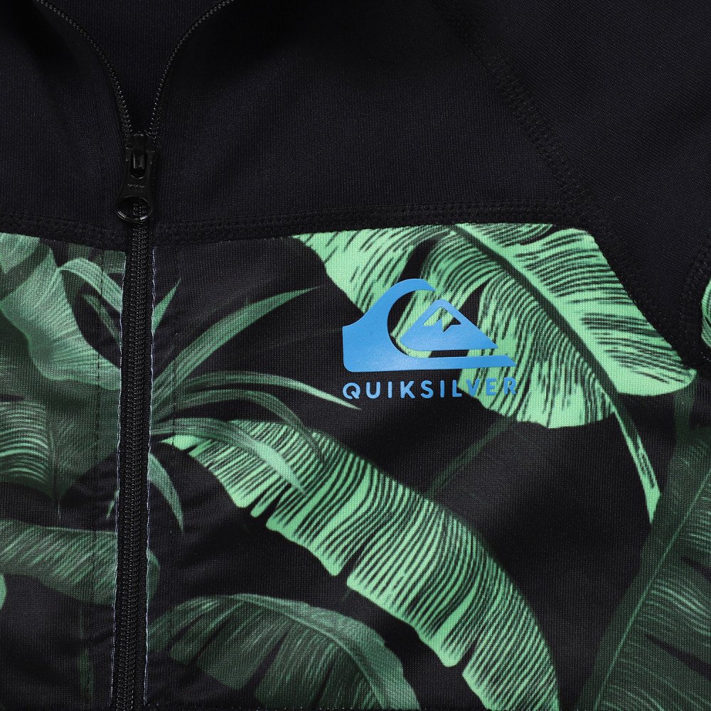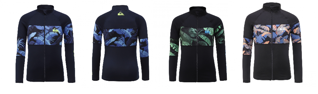 자외선 차단 지수 UPF 50+의 긴 소매 집업 래쉬가드. 몸통 전체를 가로지르는 화려한 패턴의 패널이 돋보인며,편안하게 입고 벗을수 있는 상품입니다.