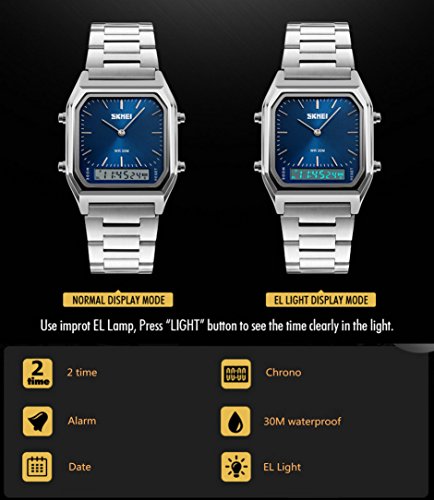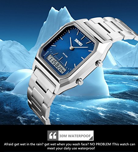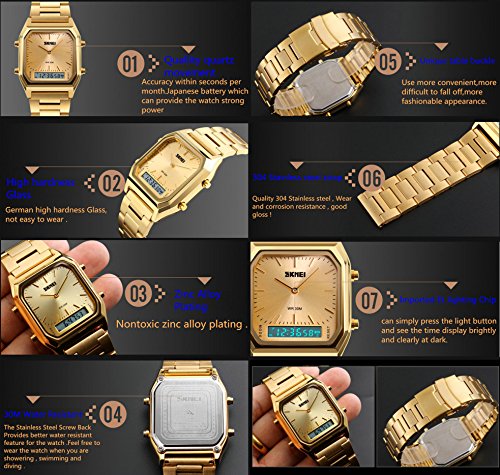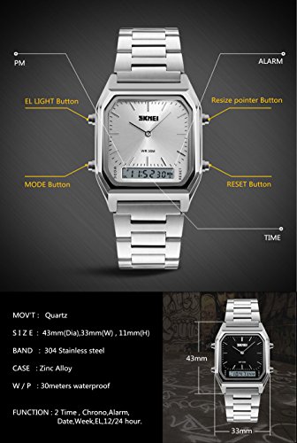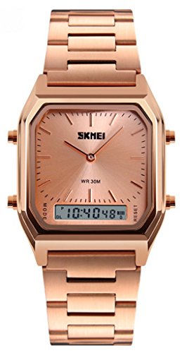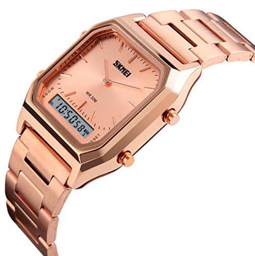 -. Feature : PRECISE TIME KEEPING and KEY SCRATCH RESISTANT WATCH FACE: original Japanese Quartz Movement, provide precise and accurate time keeping. NO MORE KEY SCRATCHES on the watch face! We use high hardness mineral glass to protect the watch front. / MULTI-FUNCTIONAL:Dual Time zone, Calendar Day and Date, Alarm, LED Display, Back Light, Shock Resistant, Stop Watch,Water Resistant.DUAL DIAL TWO TIMEZONE: analog and digital dual dial support two different timezone. / CASE MATERIAL: stainless steel .Dial Color:Rose Gold. Dial Case Diameter: 1.3 inch / 33mm approx . Dial Case Thickness:0.43 inch / 11mm approx.Band Material:stainless steel .Band Color: Silver.Band Width: 0.86 inch / 22mm approx. Band Length:9.44 inch / 240mm approx. Band Clasp Type: Double Locking Fold Over Clasp. / 98FT / 30M WATERPROOF FOR DAILY USE: 3ATM water resistant, hand wash, rain day, sweating, no problem! Perfect for all kind of business, casual, indoor activities and daily use. NOTE: Please DO NOT pull out the button under the water. Too much water contact or usage in extreme Hot or Cold temperature will damage band and shorter watch life. / STAINLESS STEEL with DURABLE and COMFORT: key scratch resistant watch face, stainless steel water proof case cover make it super durable, smooth polished stainless steel band strap provide wear resistant and comfortable wearing experience. Double Locking Fold Over Clasp, Stainless Steel Band Strap / Case, bring you back to the classic and simplicity. Also make it a great gift for family or friends.