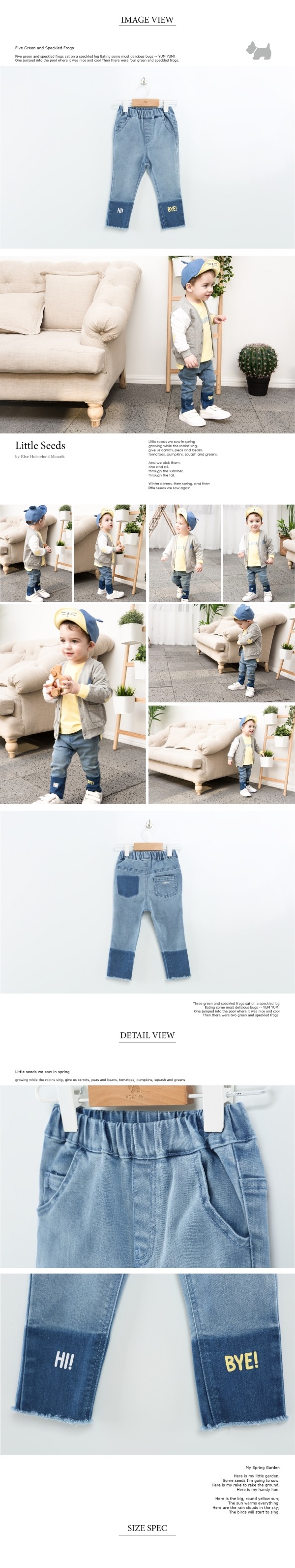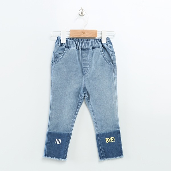 스판성 좋은 슬림핏 데님팬츠로 밑단 투톤워싱과 귀여운 레터링 나염으로 포인트를 준 스타일입니다.