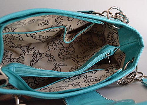 -. Feature : Magnetic flap closure with rhinestone buckle set, Middle zippered divide, Interior fully lined with a wall zipper pocket and two slip pockets / Exterior back concealed gun carry zipper pocket and two magnetic button flap closure pockets with studs on both sides / Dual leather straps, Measurement: 12 1/2"(L) x 8"(H) x 4 1/2" (W)Approx. / wallet:Front clear rhinestone belt buckle accent , Checkbook cover, 10 Credit card slots / 2 Bill or receipt slots, Exterior zippered coin pocket, Clear ID Holder, Snap button closure, Measurement:7 1/2" x 4 1/2" Approx.