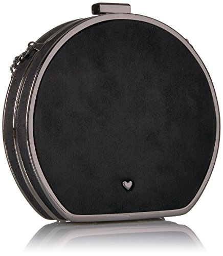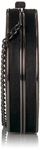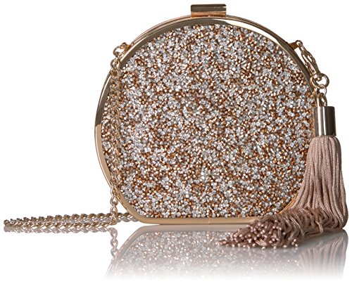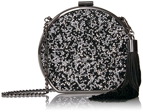 Ladies small structured round crossbody bag with hanging tassel and metal chain strap.