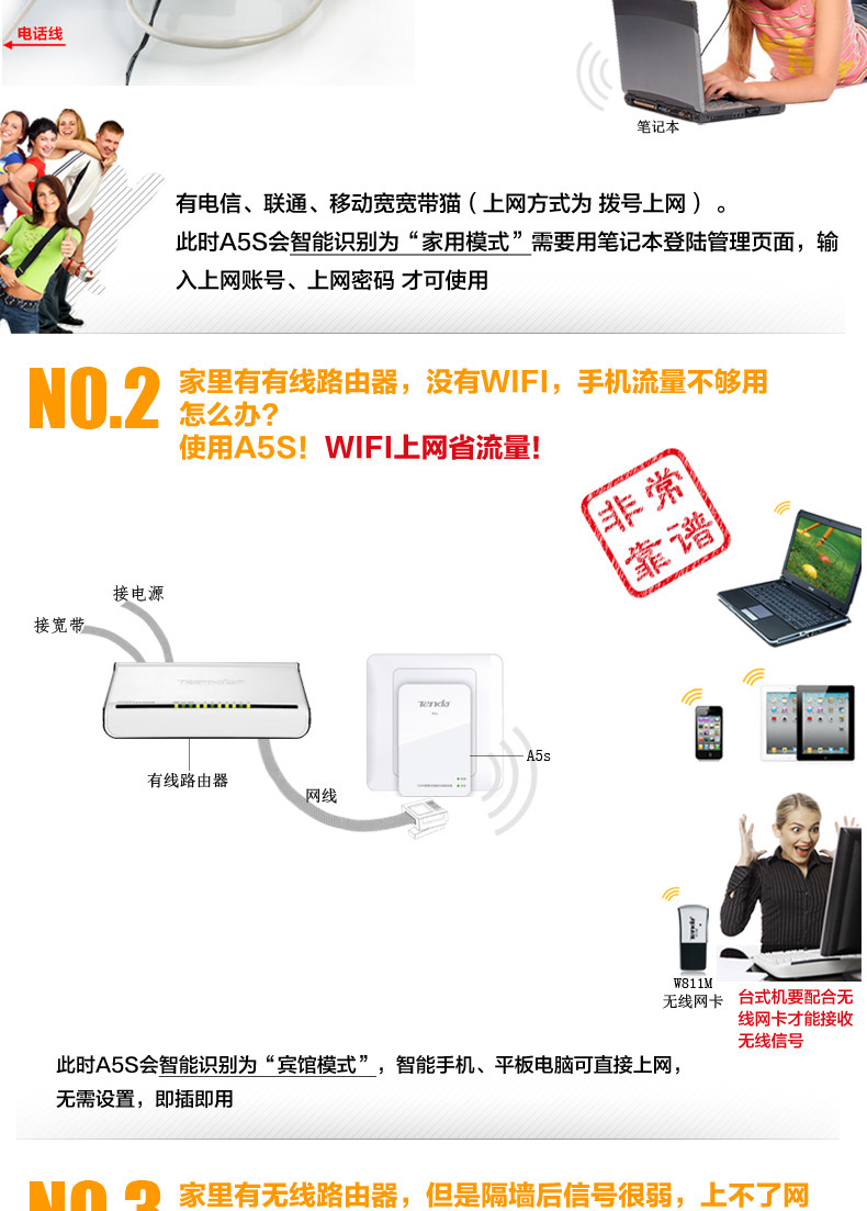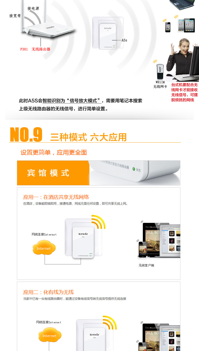 Optional Reason 1: a route, three kinds of modes, a variety of purposes, routers select the desired mode automatically according to the network cable access Smart! Hotel Mode, Home Mode, signal amplification mode! (See below for specific illustrations oh)