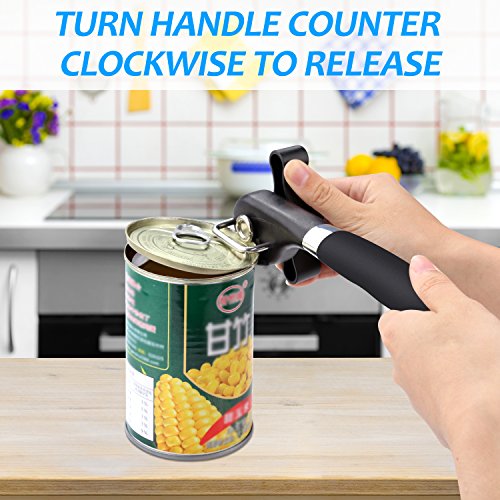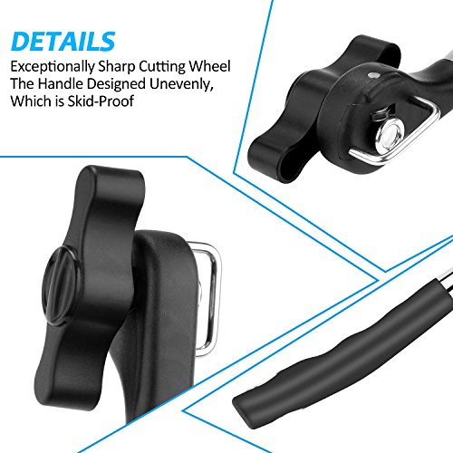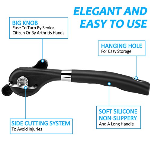 - EASY TO USE: The can opener are extremely durable and heavy duty, the stainless steel blade slices through the side of the can in one touch like butter. This manual can opener is designed with very strong knife like tooth on the wheels that grips the can tightly and stays sharp for years to come. The easy to turn non-slip turning knob makes it so that anyone can use this can opener.