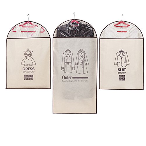 -. Feature : Home And Travel Use To Keep The Clothes From Dust, Mildew, Moisture, Insects / Long Enough For Dresses, Suits, Coats, Shirts, Skirts, Jackets, Trousers And Uniforms Etc / Breathable, Easy To Wipe Clean Protective And Acid Free / Convenient With Zipper Closure, Haped Shoulders, Top Hole For Hanger Hook (Hanger In The Picture Is Not Included) / Beige Color, Set Of 3 Of Non-Woven Fabrics Which For Dress Size: 35.43" x 23.62", For Suit Size: 35.43" x 23.62",For Outer Size:47.24" x 23.62"