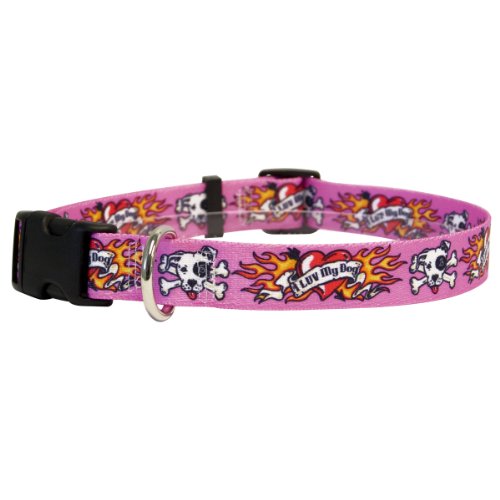 Studio : Yellow Dog Design Publisher : Yellow Dog Design Binding : Misc. Product Description This is the I Luv My Dog Pink Dog Collar with Tag-A-Long ID Tag System - Size Large - 1 inch wide and fits neck sizes 18 to 28 inches from Yellow Dog Design, made right here in the USA. Keep your dog in the latest fashion with this stylish, functional and durable dog collar. TAG-A-LONG - This brand new, patent pending Pet ID Tag system is built right in to this dog collar. The Tag-A-Long system makes it easy to swap out ID tags from one collar to another, or to change ID Tags on the same collar. Perfect for when a special tag is needed at the dog park, on the beach, or as a service dog. We've included this special feature at no cost! EASY ON EASY OFF - Using a quick release clasp, the collar can easily be taken on or off the dog. Don't worry though, opposable thumbs are necessary to activate the quick release. SIZING: This dog collar utilizes a quick clasp closure, also called a side release clasp. Sizing is given as a range of neck lengths. Measure your dogs neck size or its current collar length (not including buckles) to obtain correct sizing. If you are shopping for designer, affordable dog/pet collars, then look no further. These durable, guaranteed to last dog collars have no rough edges, no threads to fray or break, no problem going in the wash, and no stress getting them on or off your dogs. 0