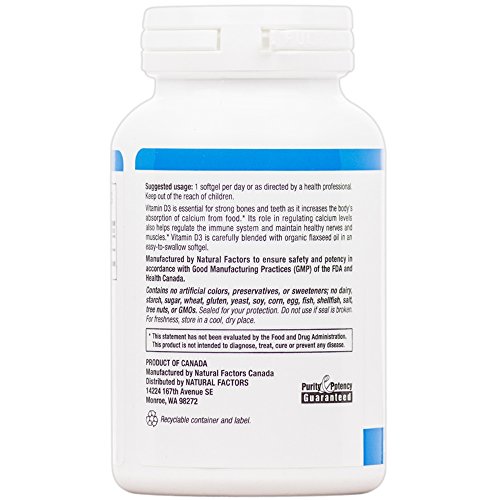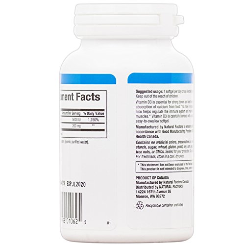 ReleaseDate : 2014-03-19 Studio : Natural Factors Publisher : Natural Factors Binding : Health and Beauty Product Description Vitamin D is called "the sunshine vitamin" because we can usually get it from the sun's ultraviolet rays. People who live far away from the equator may not make enough vitamin D in their skin during long, gloomy winters. It is essential for bone development and is needed for calcium and vitamin C absorption and it supports the nervous system. Vitamin D plays a dual role as both a vitamin and a hormone. Natural factors uses Vitamin D3, which is the form found in fish oils and eggs, and is produced by sunlight on human skin. Vitamin D3 (cholecalciferol from animal source) is derived from sheep wool lanolin. 0