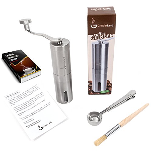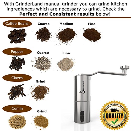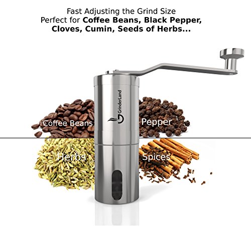 -. Brand : GrinderLand -. Feature : ✓ PREMIUM QUALITY - The GrinderLand manual coffee grinder is Ferrari between the others coffee mills. This Burr Grinder is precisely crafted from high quality 304 stainless steel to serve with top performance, high durability and solidity in the everyday use / ✓ SUPERBLY DESIGNED - This portable hand coffee grinder is thin, light and fits perfectly in hand. This is the ONLY grinder of its kind with a stainless steel handle (the others have cheap plastic handle). Our STAINLESS STEEL HANDLE will last much longer than cheap plastic handle / ✓ PRECISE CONSISTENT GRINDING - the grinder is equipped with conical ceramic burrs. The ceramic burrs are easily accessible and adjustable within seconds. Thanks to precisely sharp ceramic stones is ensured the most precise grinding results with minimum effort. According to your favourite setting you can grind fine or coarse. Perfect for brewing with your French Press, Chemex, Aeropress, Dripper or any other Coffee Lovers brewer method / ✓ STEERING PERFORMANCE - thanks to new innovated more ergonomic stainless steel handle you will grind much easier, because there is leverage effect. Our handle has also new robust rivet. With this innovation we can sure you that our stainless steel hand crank is indestructible / ✓ WHY THIS GRINDER? Easy and fast adjustable, all body made from stainless steel, innovated indestructible hand crank, precise sharp ceramic burrs, easy maintenance, aeropress compatible. 100 % Money-Back Guarantee! -. Label : GrinderLand -. Manufacturer : GrinderLand -. ProductGroup : Kitchen -. ProductTypeName : KITCHEN -. Publisher : GrinderLand -. Studio : GrinderLand -. Title : Hand Coffee Grinder with Adjustable Conical Ceramic Burrs | Premium Manual Mill Suitable for Coffee Beans, Herb, Spice and Pepper | Sturdy Stainless Steel Body and Handle - (Standard)