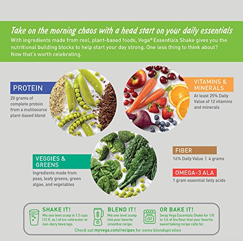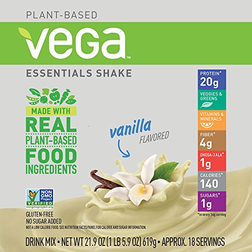 Vega Essentials Shake has the nutritional building blocks to help you start your day strong with ingredients made from real, plant-based foods. Each serving has 20 grams of plant-based protein, veggies and greens, vitamins and minerals, as well as 16% DV fiber and 1 gram Omega-3 ALA. Help take the guesswork out of daily nutrition when you enjoy no sugar added*, Non-GMO Project verified, gluten-free, and certified vegan Vega Essentials Shake in delicious Vanilla, and Chocolate flavors.