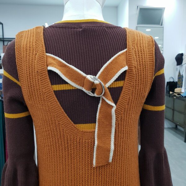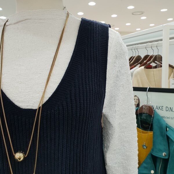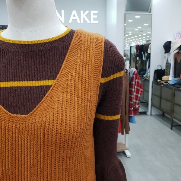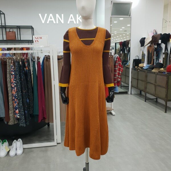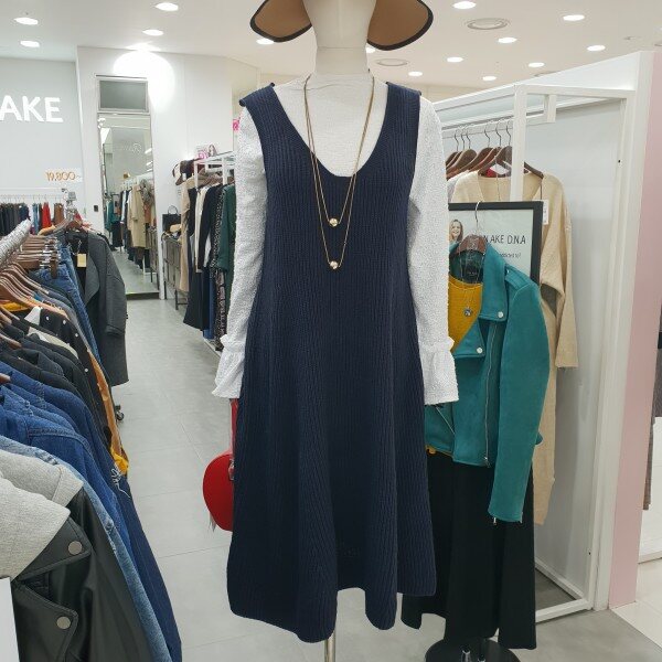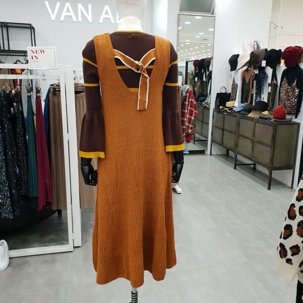 백 스트랩포인트와 세미플레어로 떨어지는라인이 여성스러운디자인의 니트원피스카멜,네이비 컬러구성