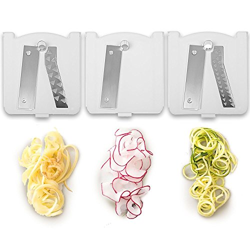 BPA-free lightweight plastic body and 3 stainless steel blades for thick noodles, thin noodles and ribbons. Storage compartment locks blades securely in place