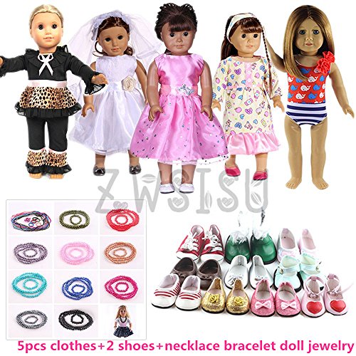 -. Feature : ★ includes white wedding party dress set, cute 1 pieces pajama dress, modest pink dress,Dolphin swim clothes,cool Leopard clothes set random colour necklace bracelet jewelry, and 2 pairs random shoes perfect for any special occasion / ★ Package Include Total 8pcs= 5 Sets Doll Clothes+doll jewelry+2 pairs shoes / ★ Made by ZWSISU® , Leading Doll Clothes & Brain Creative Product Manufacturer. Not affiliated with American Girl®, Reg. Trademark of American Girl, LLC. / ★Luxurious high quality fabrics, machine washable, safety tested / ★Made to fit 18 Inch dolls such as American Girl, Madame Alexander, Our Generation, etc.
