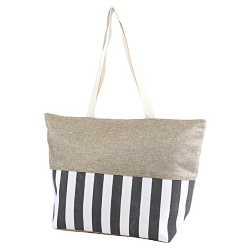 Large Zipper Top Stripe Print Canvas Beach Bag Tote - 22"x14"x7"