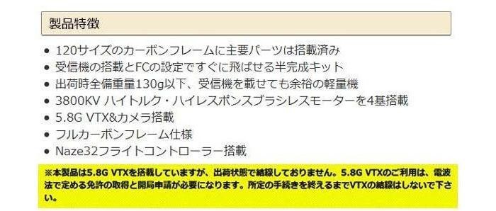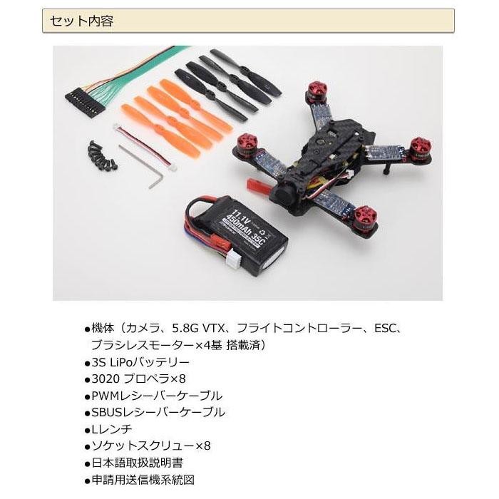 120サイズのカーボンフレームに主要パーツは搭載済み。受信機の搭載とFCの設定ですぐに飛ばせる半完成キットです。 |