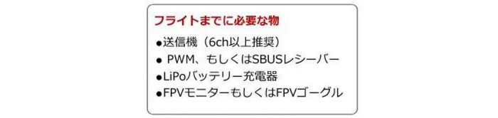 | 仕様 | バッテリー:3S Li-Po 450mAh 充電時間:約1時間(※バッテリーの状態によって異なります) フライト可能時間:約5分 電波到達範囲:使用する送受信機により変動 対象年齢:14歳以上 |
